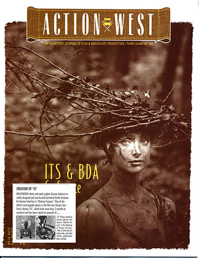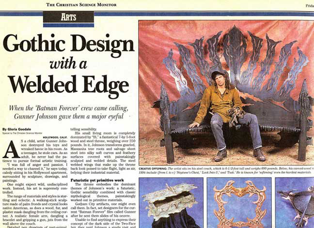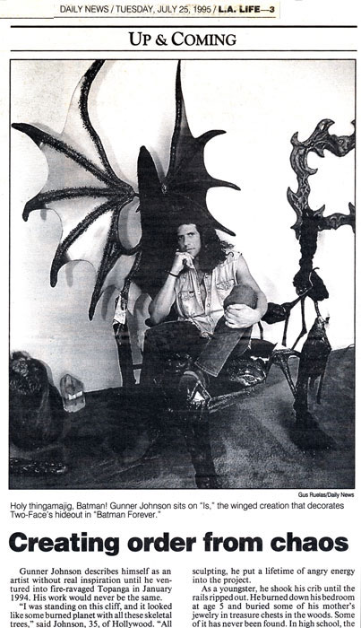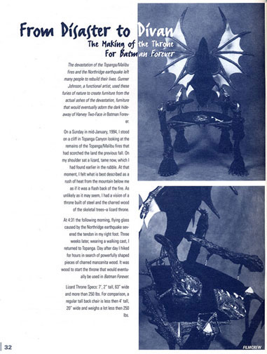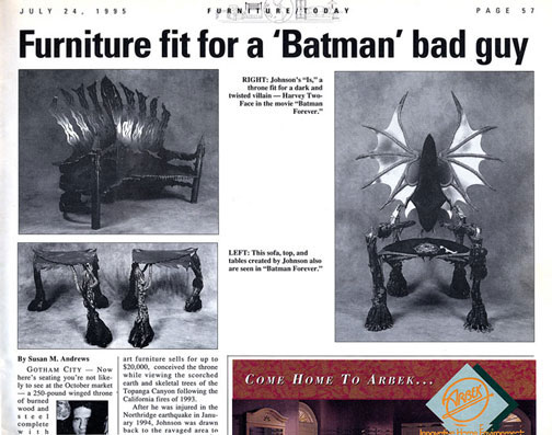 The devastation of the Topanga/ Malibu fires and the Northridge earthquake left many people to rebuild their lives. Gunner Johnson, a functional artist, used these furies of nature to create furniture from the actual ashes of the devastation, furniture that would eventually adorn the dark hideaway of Harvey Two-Face in Batman Forever.