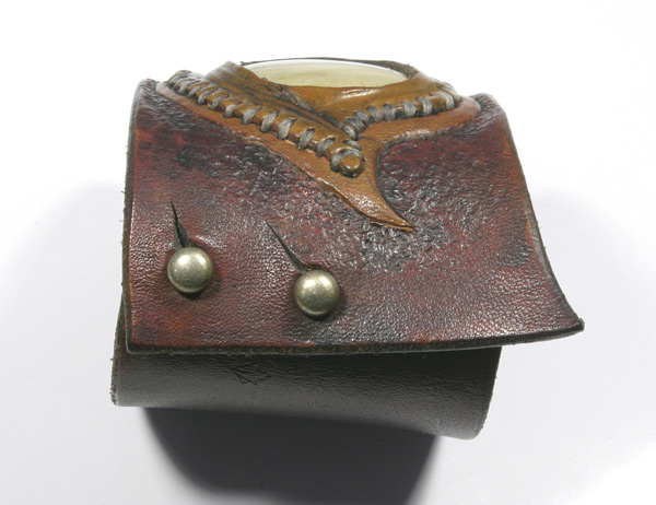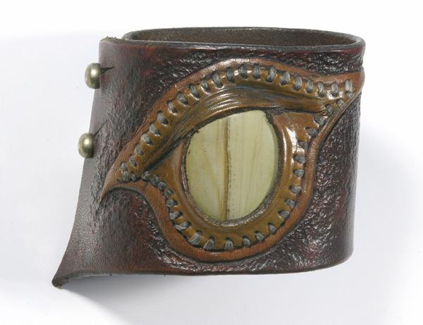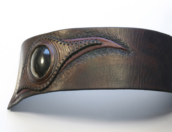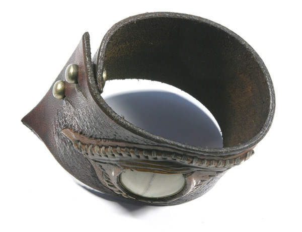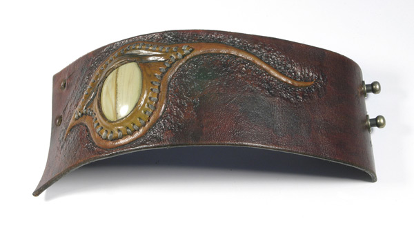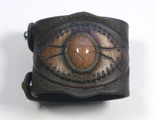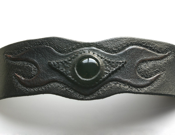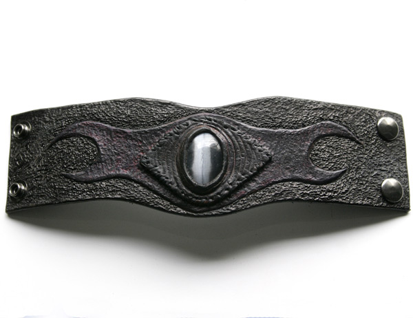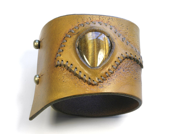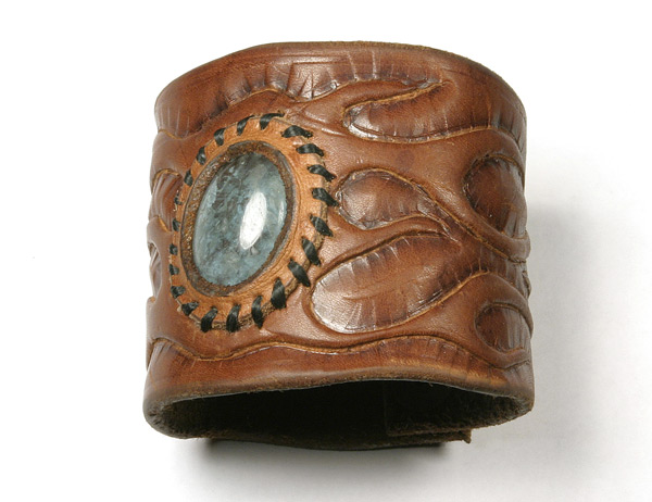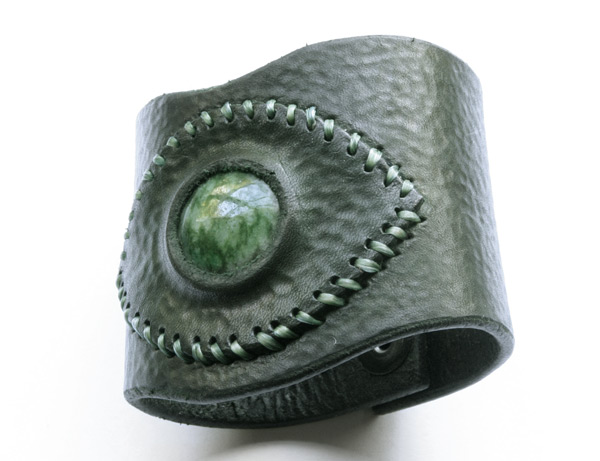 I use high quality 6-7 ounce leather. And cut my own lace when used. Each cuff is custom, handmade, carved, tooled leather. I hand sew each stone onto the cuff with a leather bezel using artificial sinew. I use dye, and in some cases, acrylic paint for highlights, which soaks into the leather like dye and doesn't fade. I give each and every one of my leather bracelets and their components the highest quality individual attention in workmanship with every detail.