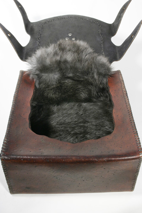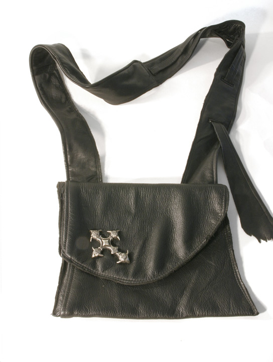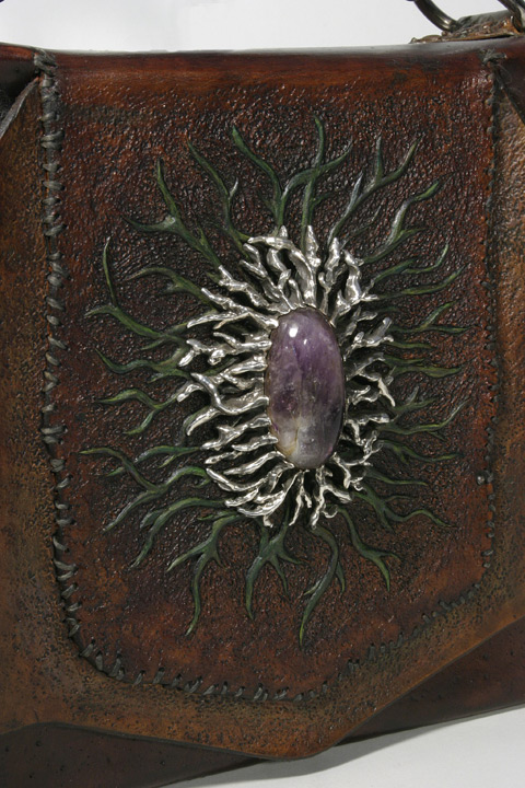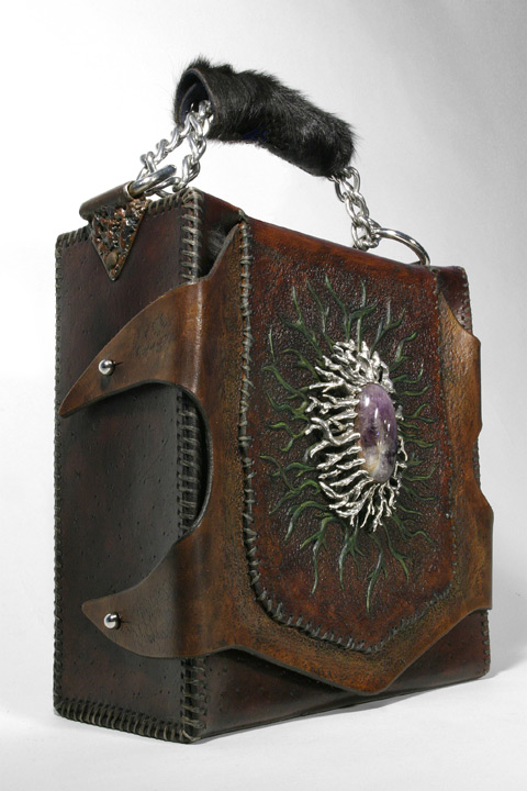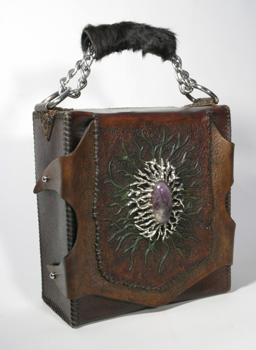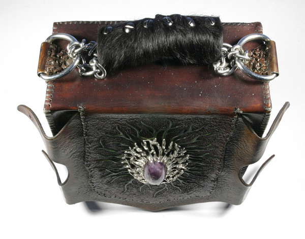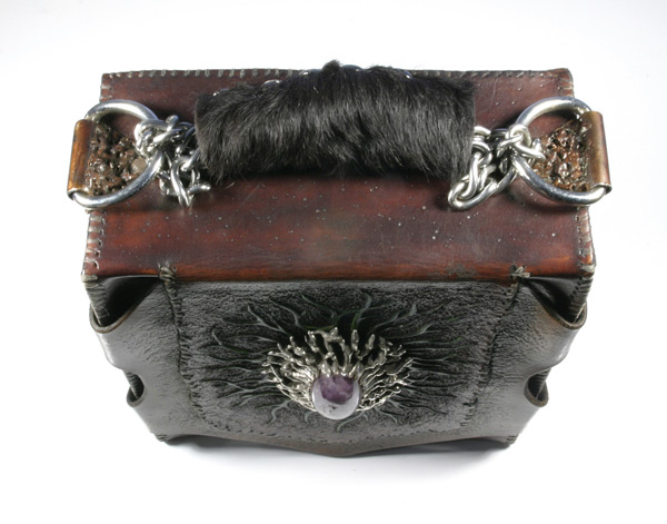Ingredients - Leather, sterling silver, amethyst stone, steel, metal, rabbit fur, screws, nickel plate buttons, chain, cowhide handle