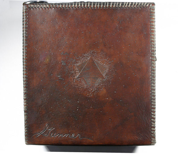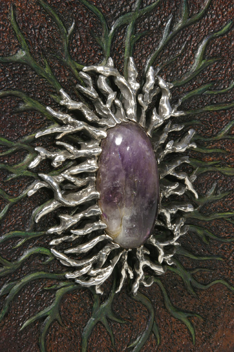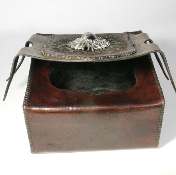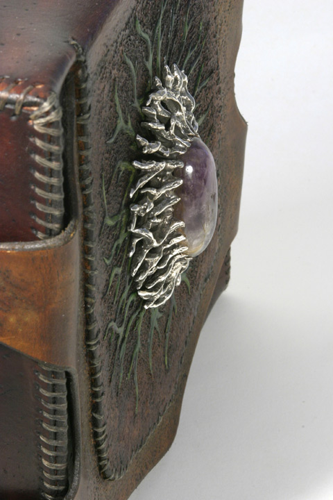 The first case you see in the line up is what people seem to call the "Man Box". Made with 10 ounce leather. Handmade, hand sewn with artificial sinew, carved, tooled leather. Center piece was carved from wax and sculpted around the amethyst stone. Cast in sterling silver. No mold was made from the cast. Corners at the top of the case that hold the silver 1/2 circles I made from steel. I welded texture on, rusted and clear coated them. I used dye and paint on this case.