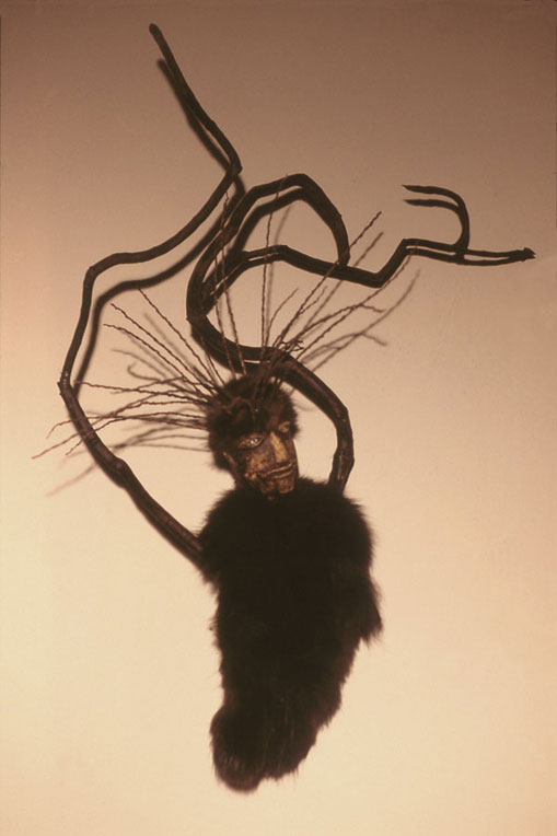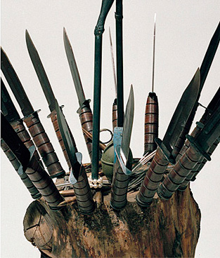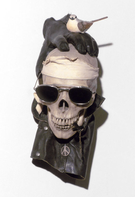 Plastics, leather, steel rods, rubber, carved wood, modeling paste, iguana skulls, pelican skull, KBAR military knives, hand grenade, gourd, stones, crystals, hair, black onyx, hackle feathers, branches, tree seal, water putty, cement, ceramic tiles, plastic, found objects, glass, dental cement.