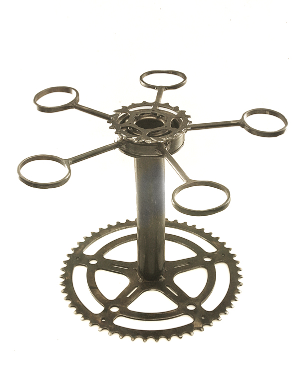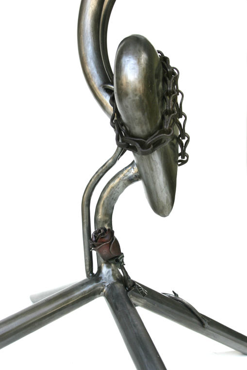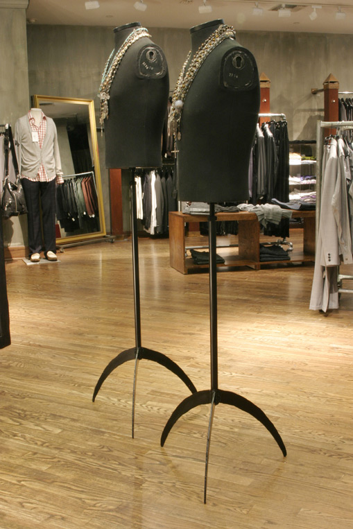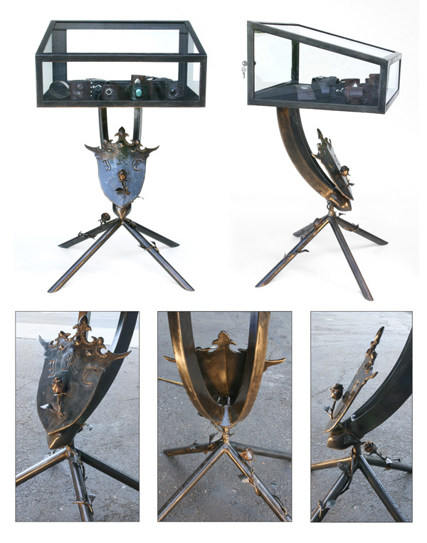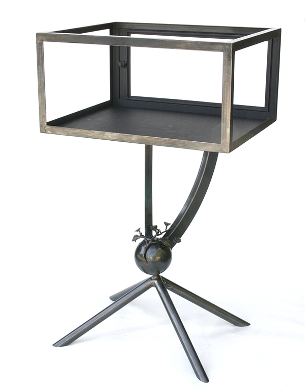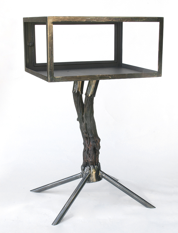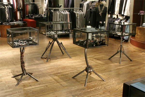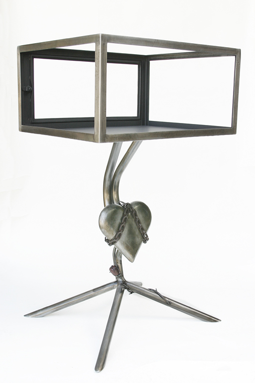 These metal art, showcases the specific jewelry style for which they were made. Art furniture approximately 30" - 35" tall. Made of steel, glass, manzanita wood. And have velvet or glass platforms inside to showcase the jewelry. Patina was used for color. All cases have locking doors.