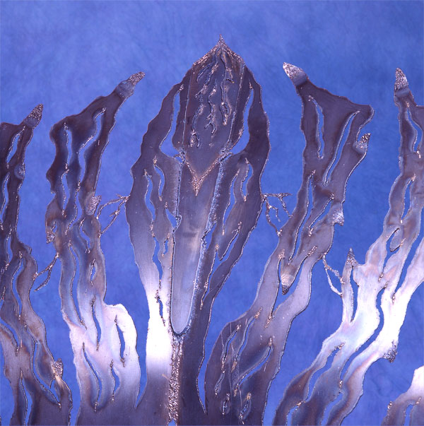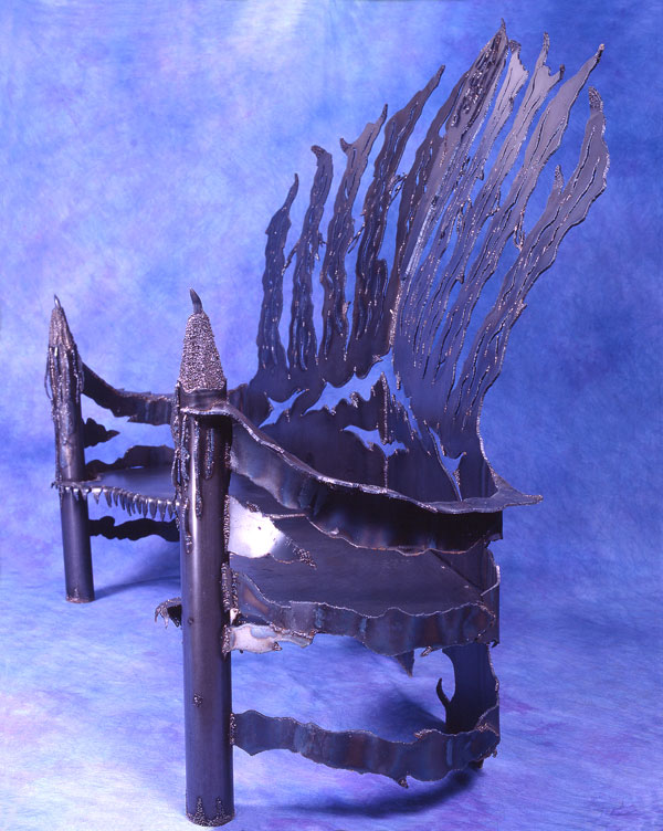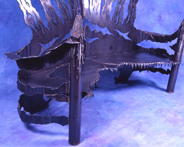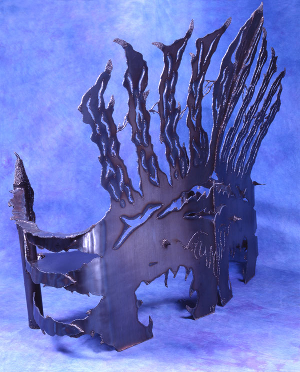 I drew the designs onto two welded together 4' x 8' x 1/4" pieces of steel weighing 326 lbs. each. Creating an 8' x 8' wall. I used oxy-acetylene to torch cut the designs out. While the back of the sofa was free standing without the rest of this metal sculpture constructed, I proceeded to hammer out the shapes I torched out. I was pounding too hard and the entire piece started falling backward. And in that same moment, I realized my welding tanks were still in back of the sculpture. I turned around and ran like hell out of my studio.