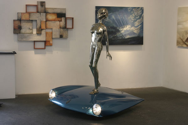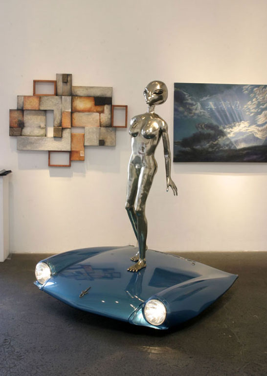 To contemplate and build the entire sculpture, construct the hood into a hovercraft above and below, repair the dents, bondo, sand and paint took about 5 months. The entire piece rotates 360 degrees on a heavy duty steel stand, and all lights function.